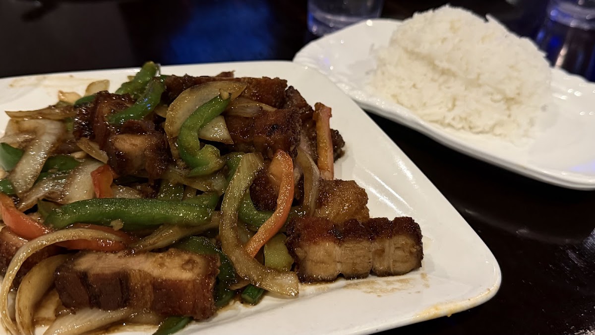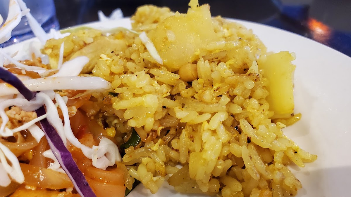 Very friendly staff. Quick service. Fresh, hot food. We arrived when they opened at 4:30. On a previous visit we had the pad kae mao noodles, a classic. We ordered the green curry and pineapple fried rice with soft tofu and no mushrooms. The pineapple fried rice tasted good. If you are sensitive to the smell of eggs, we suggest you ask for no eggs. The pineapple trunks were a little too large for our preference and they forgot the remove the mushrooms. By the time our food arrived, the restaurant was packed. They get really busy! The green curry was good, we took leftovers home and it tasted too sweet.